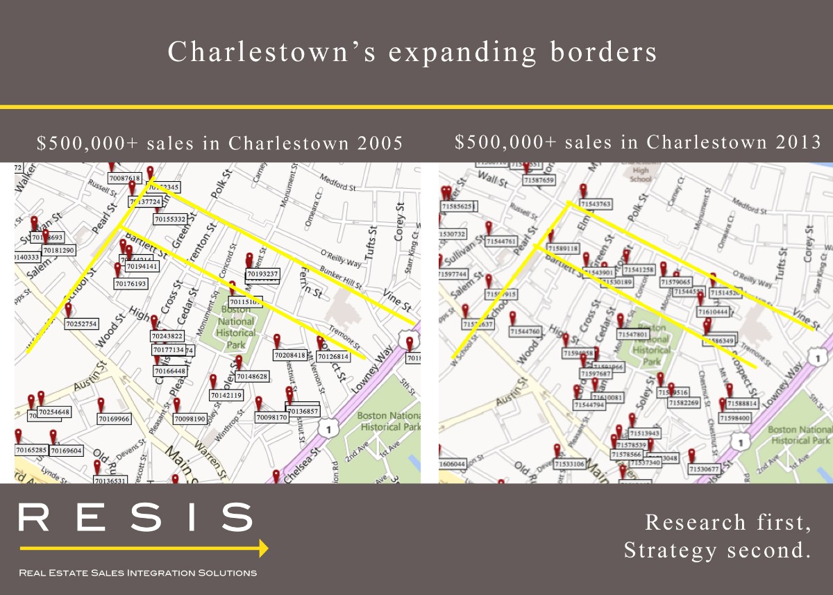 For example, look at the evolution of Charlestown (see image here). In 2005, condominium sales surpassing the $500,000 price point occurred primarily from the Bunker Hill Monument down throughout the Gaslight District. School Street and Bartlett Street became perceived boundary marker containing the majority of sales above $500,000. In 2013, with an abundance of buyers wanting to purchase a Charlestown condominium in combination with very scarce inventory, we see those perceived boundaries move. The corridor between Bartlett Street and Bunker Hill Street became a viable source of new inventory for the Charlestown condominium market. In addition, more buyers entered the Charlestown market by moving beyond School Street and heading towards Sullivan Square and moving beyond Bartlett Street heading towards Terminal Street and the water.  The pre-existing neighborhood boundaries couldn’t supply enough inventory to satisfy the market needs, as evidenced by the staggering 43% of sales that sold above asking price.